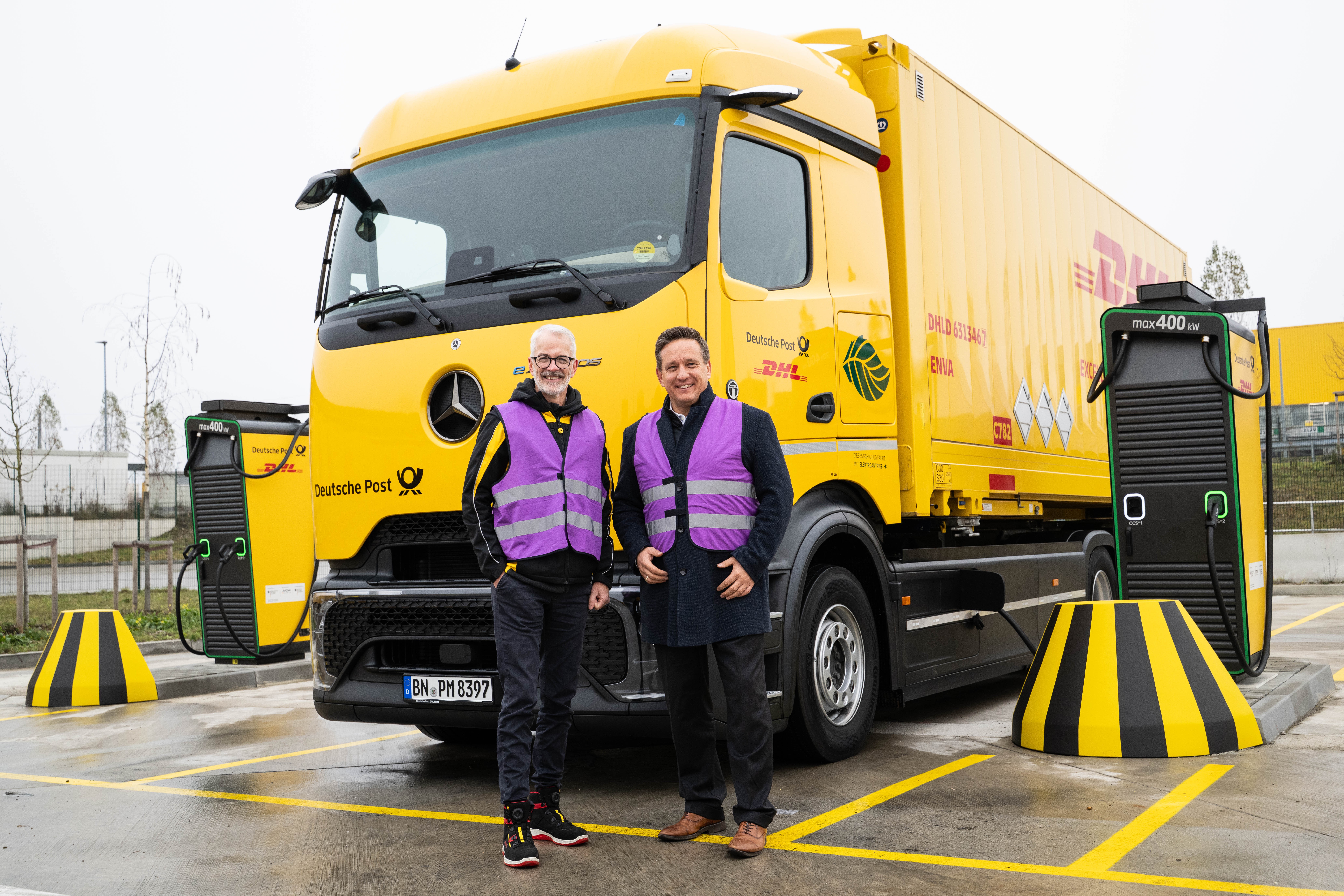 DHL Group setzt im deutschen Post- und Paketmarkt derzeit 17 E-LKW ein. Hinzu kommen 450 CNG (Compressed Natural Gas)-Lkw, die an zehn CNG-Tankstellen - ebenfalls an Paketzentren - aufgeladen werden können. In der Zustellung sorgen 35.000 Elektrotransporter für eine emissionsarme Zustellung bundesweit, hier ist bereits mehr als die Hälfte der Flotte elektrifiziert. Über 40.000 E-Ladepunkte stellen eine betrieblich optimale Aufladung der Fahrzeuge sicher. Diese Ladestationen sind aber nicht vergleichbar mit den Hochleistungsladepunkten für E-LKW, da für letztere die hundertfache Leistung benötigt wird.