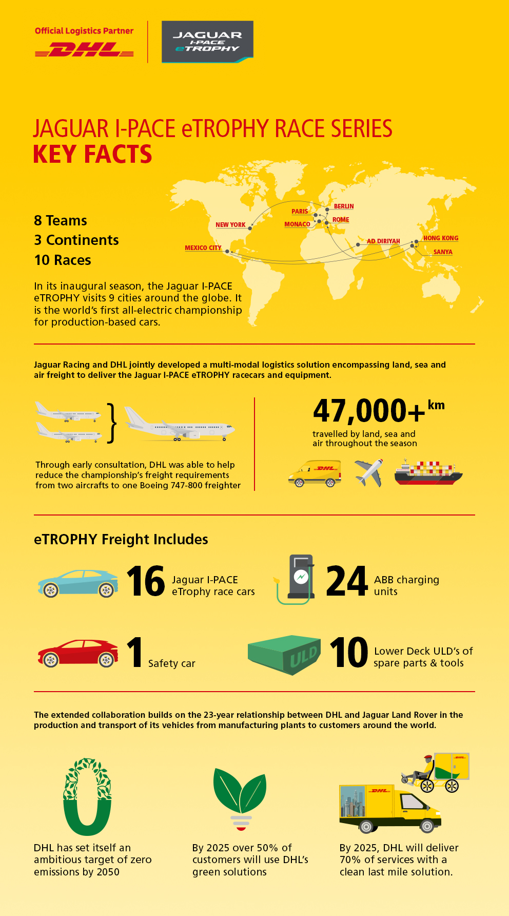 Jaguar Racing and DHL jointly developed a multi-modal logistics solution encompassing land, sea and air freight to deliver the Jaguar I-PACE eTROPHY racecars and championship equipment, safely, efficiently and on-time. Through early consultation, DHL was able to help reduce the championship's freight requirements from two aircrafts to one Boeing 747-800 freighter. The two brands are working together to develop innovative and bespoke packaging solutions to minimise freight and thus improve the championship's ecological footprint.